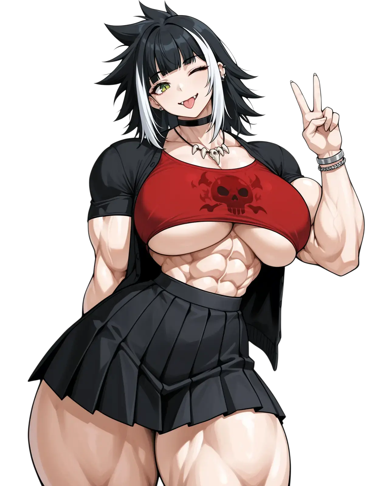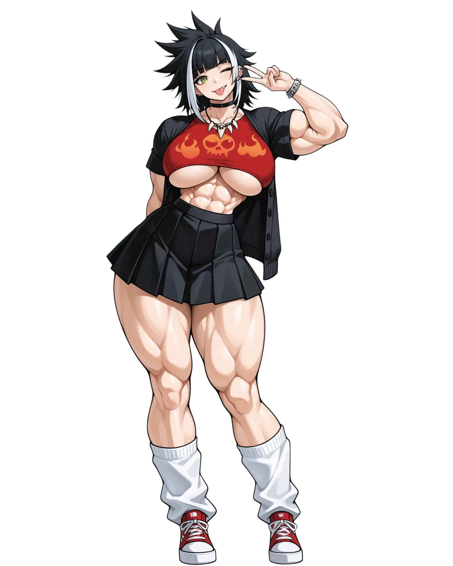 Her character and design merge various aspects from Melanie and Rhia’s design. She’s fairly energetic, like Rhia, but has a deadpan delivery like Melanie. She has Melanie’s black hair and blunt bangs, but also white streaks and “spiked” hair like Rhia. Green eyes, but with slit pupils, wears a choker, but also Rhia’s tooth necklace etc. She is more of a grower, but ultimately similarly well endowed. However, she doesn’t like to show off, unlike her mother Rhia.
