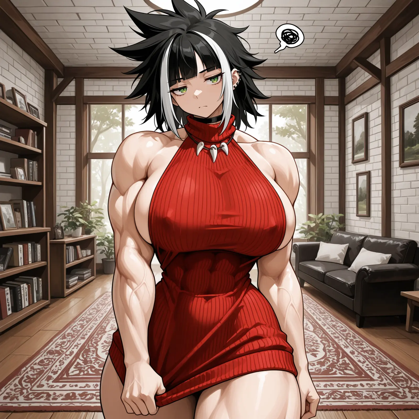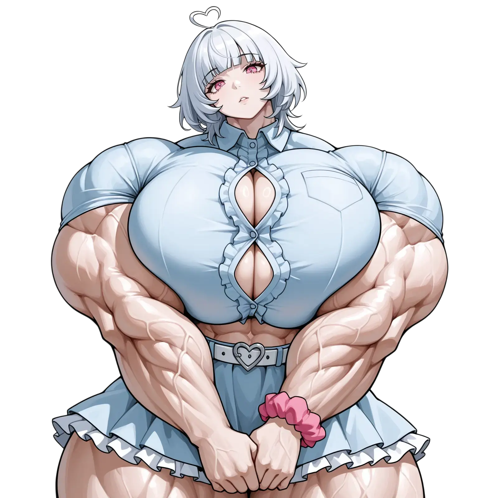 Yuki is Cassy’s daughter and the older of the two Kanayama children. She has a minor melanin deficiency, resulting in white hair, fair skin and pink eyes. She has to be careful in the sun, but is more than healthy otherwise — eclipsing her mother on basically all metrics… taller, even more muscular and… more cushioning up front. 😉 Of course, she also inherited the characteristic heart ahoge! As she is even taller than Cassy and those two are the tallest members of the Kanayama family by a long shot, Yuki’s sometimes dubbed Shiroyama-chan.