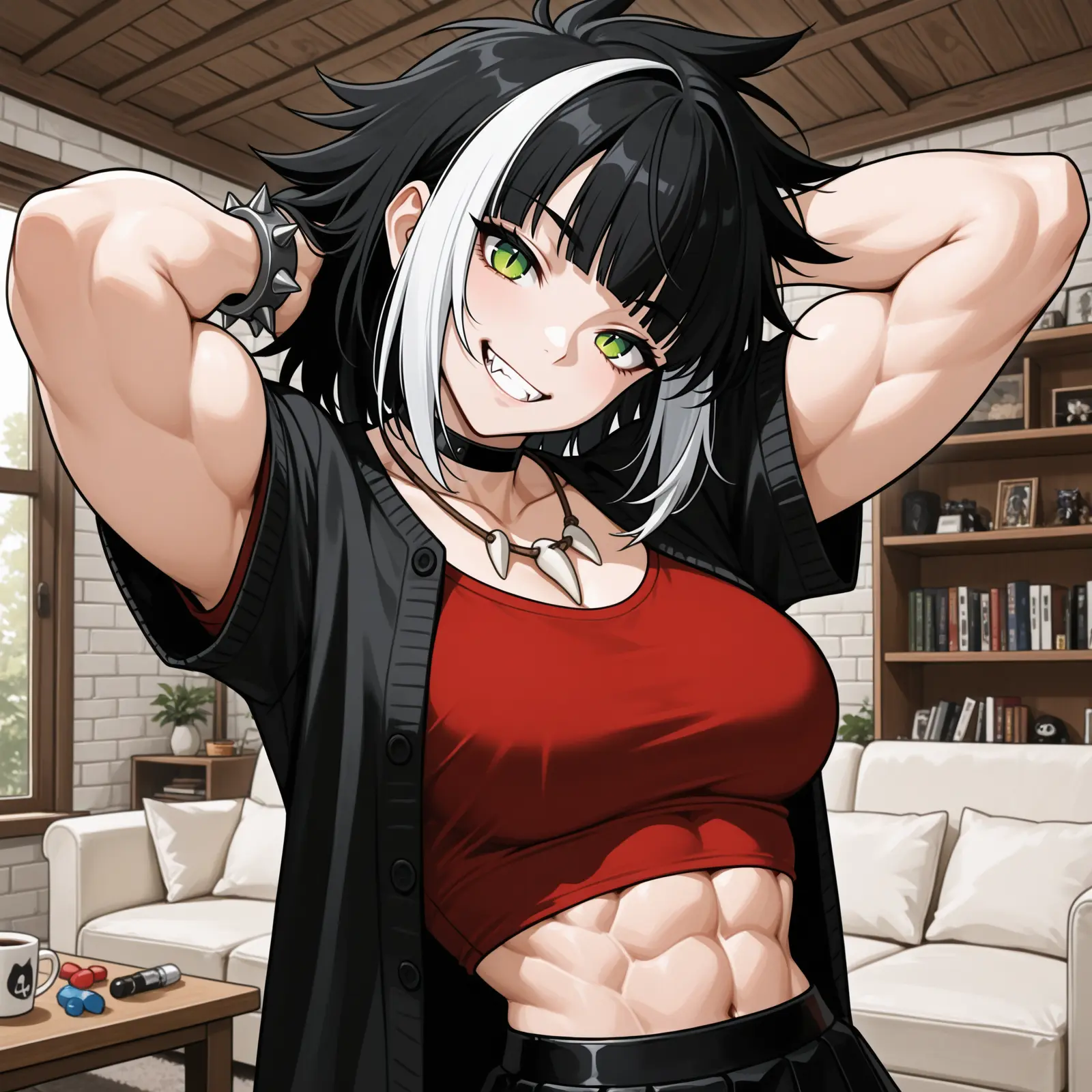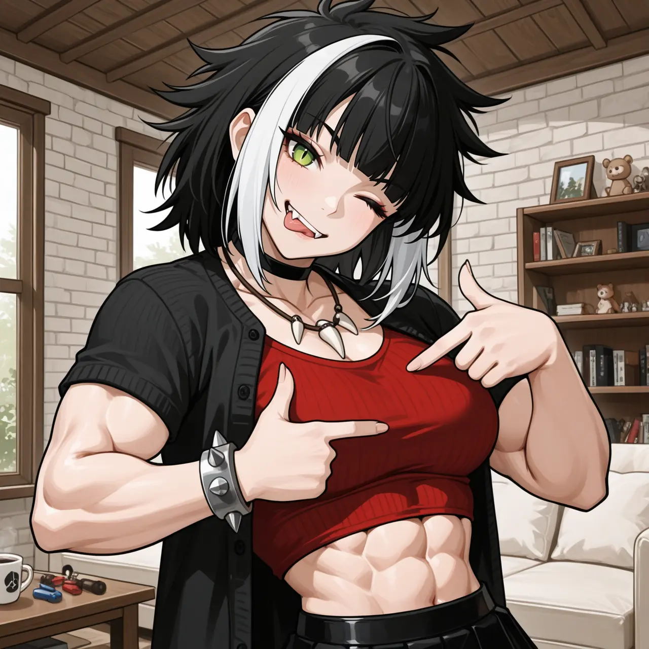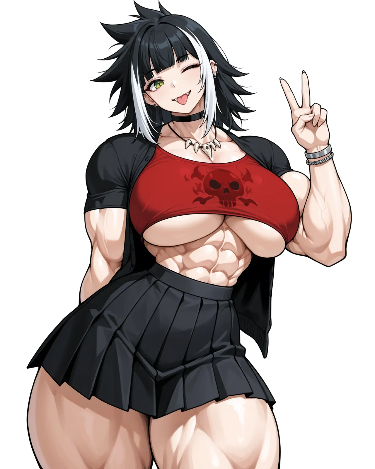 Hair color: Black with white streaks
