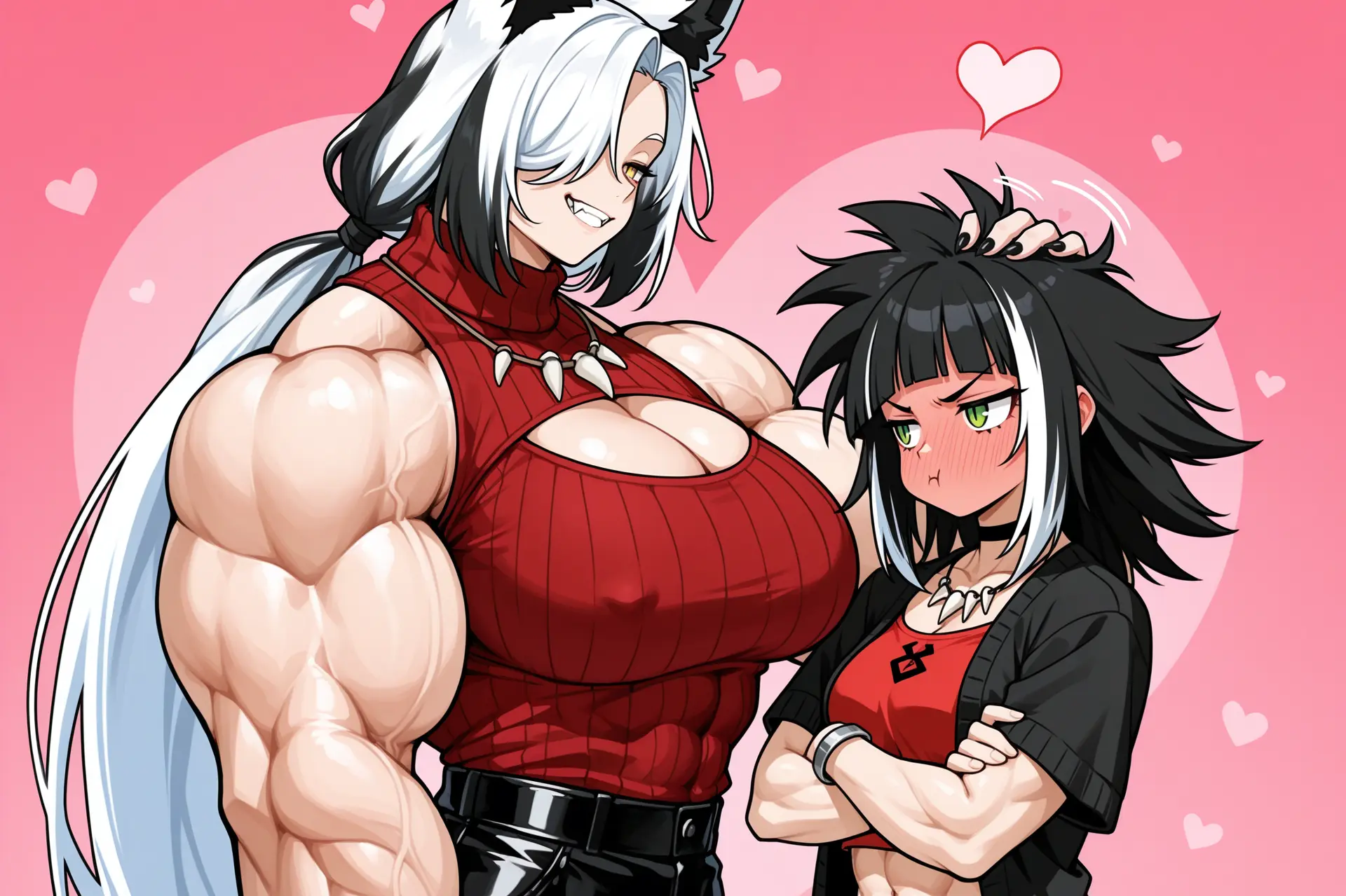 Yuki has a minor melanin deficiency, resulting in white hair, fair skin and pink eyes. She has to be careful in the sun, but is more than healthy otherwise — eclipsing her mother on basically all metrics… taller, even more muscular and… more cushioning up front. 😉