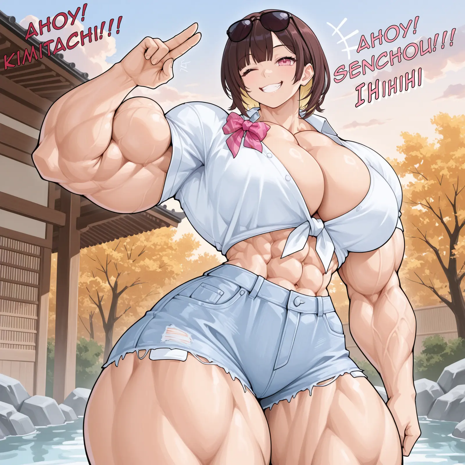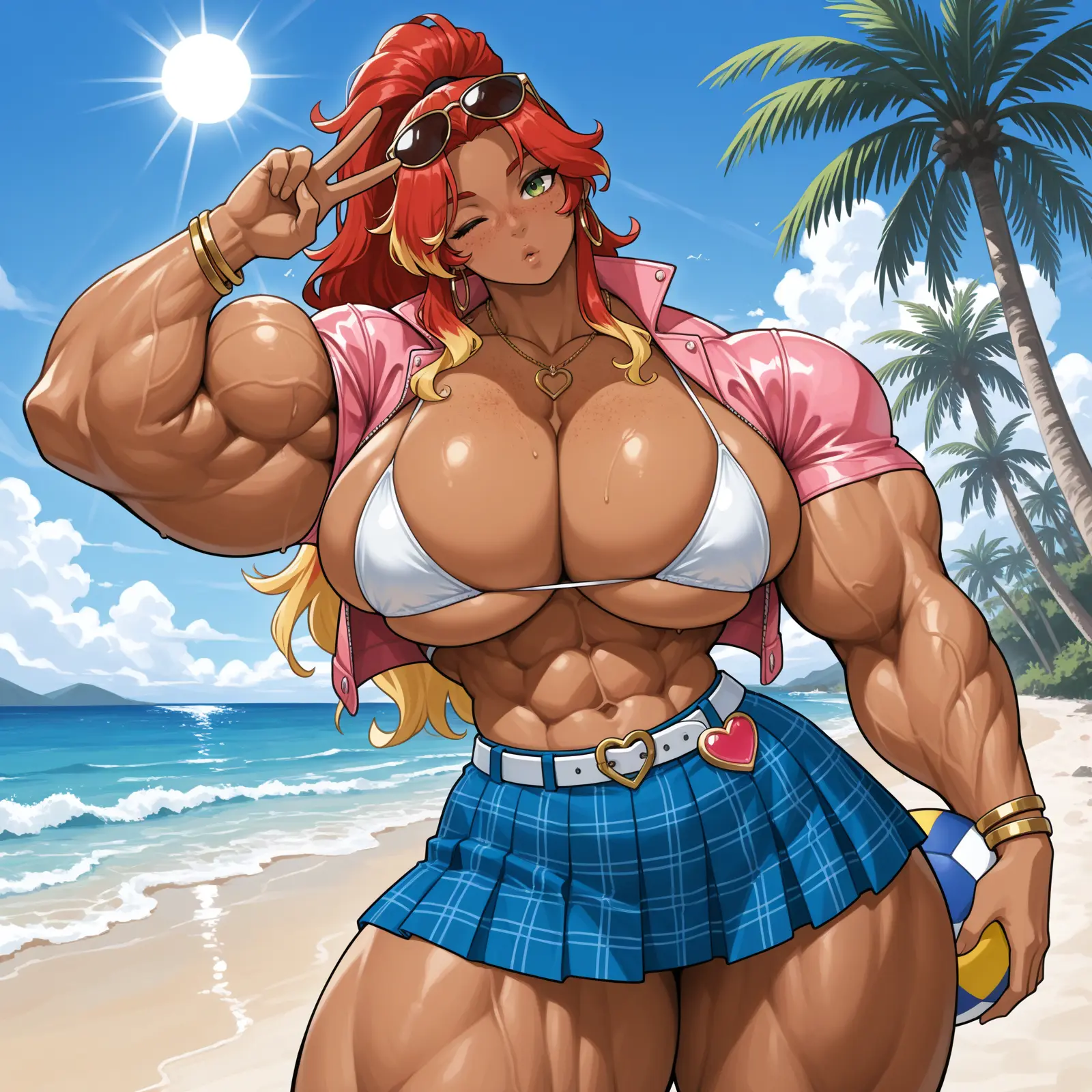 She has her father’s green eyes and tan, and is currently into “aunt” Cassy’s gyaru fashion from the past. In most other aspects, she resembles her mother… fiery red, untamed hair, freckles, blunt, no-nonsense, open for anything… also in bed… and prefers her arms big and her Scots brogue thick.